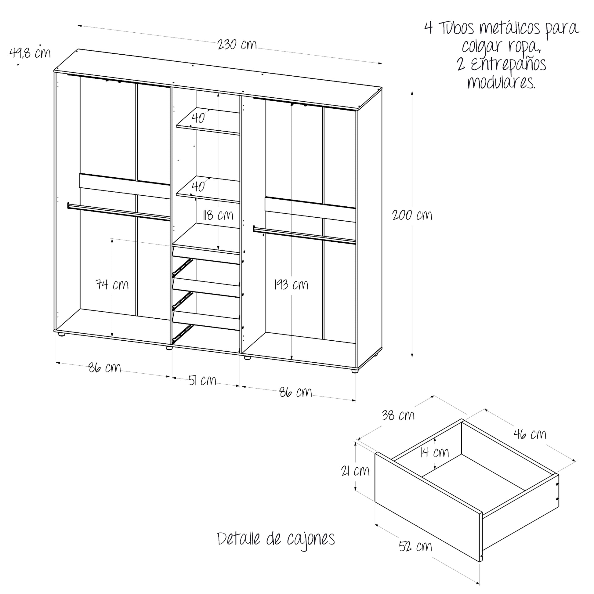 Ancho: 230cm Alto: 200m Profundidad: 49.8cm Color Gales-Wengue Peso: 133,75kg