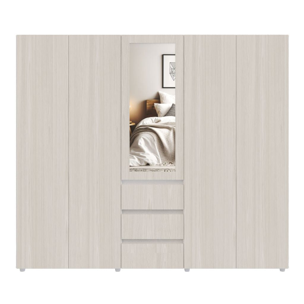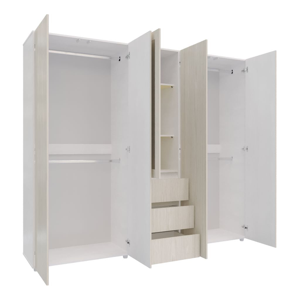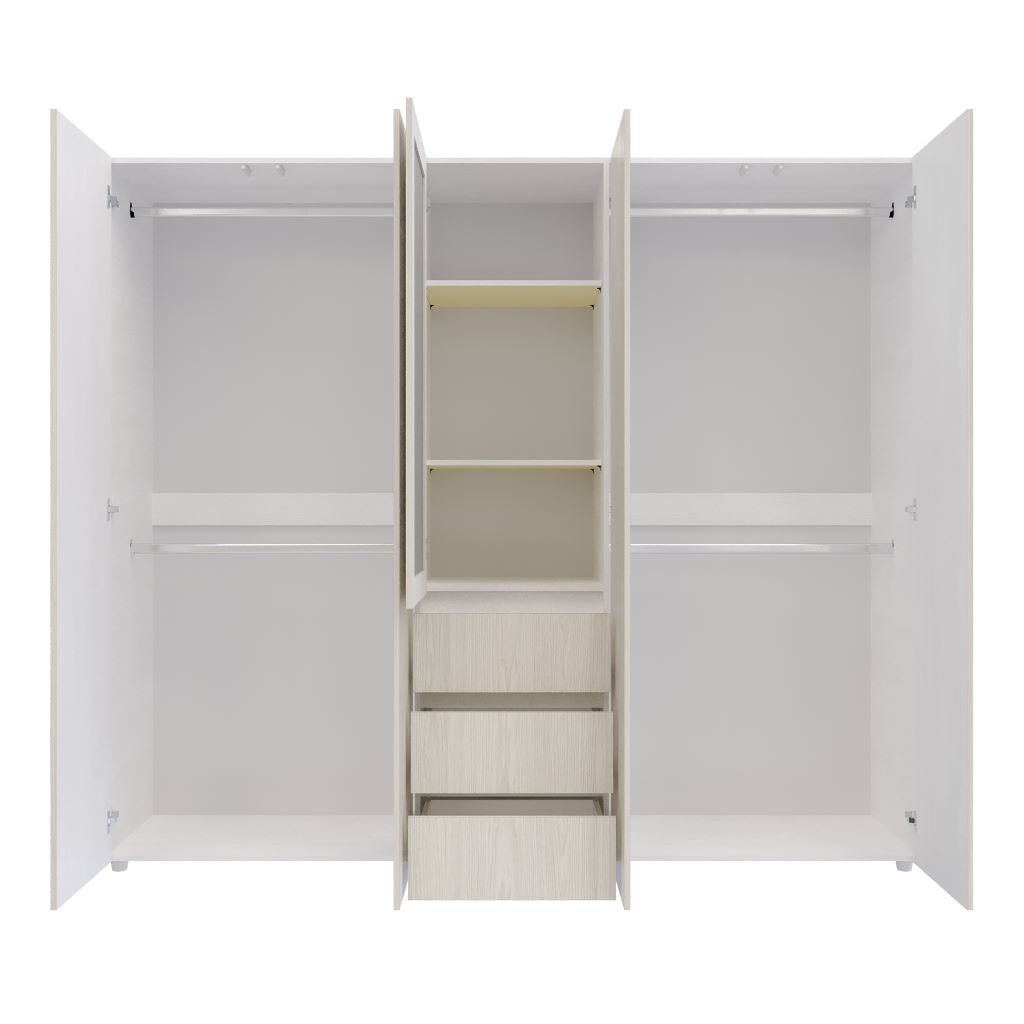 El Armario Java 230m color Niebla-Blanco cuenta con 5 puertas abatibles sin manija (1 con espejo), 4 tubos para colgar prendas largas como abrigos y vestidos o jeans; 3 cajones y 3 nichos para guardar zapatos, ropa doblada, ropa de cama u otros elementos.