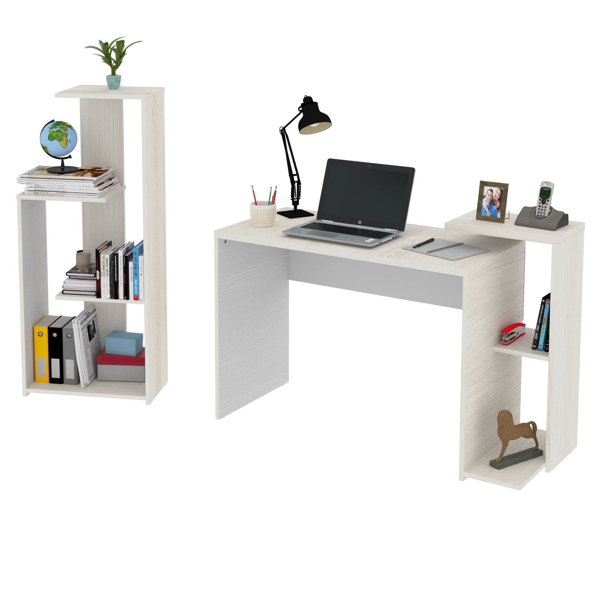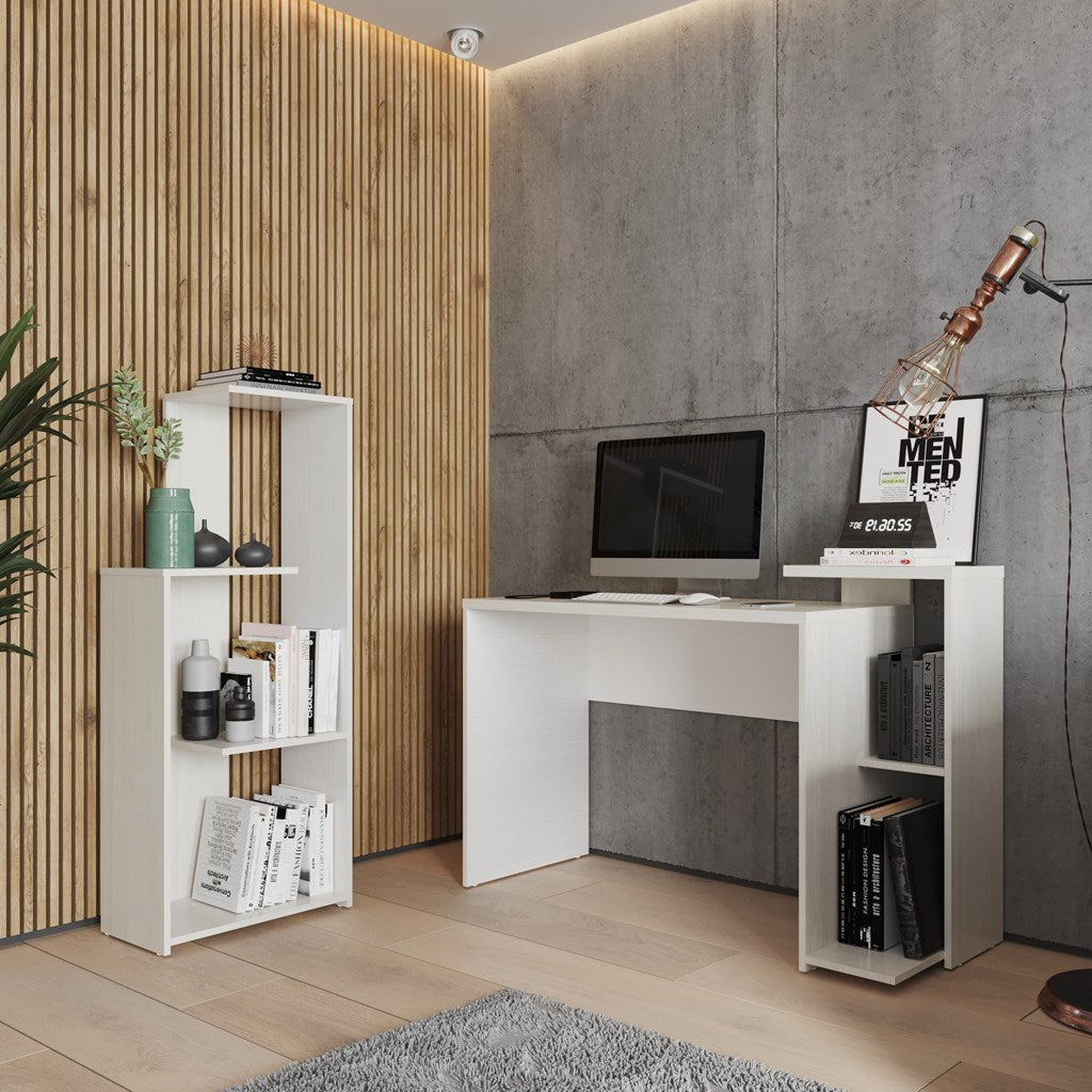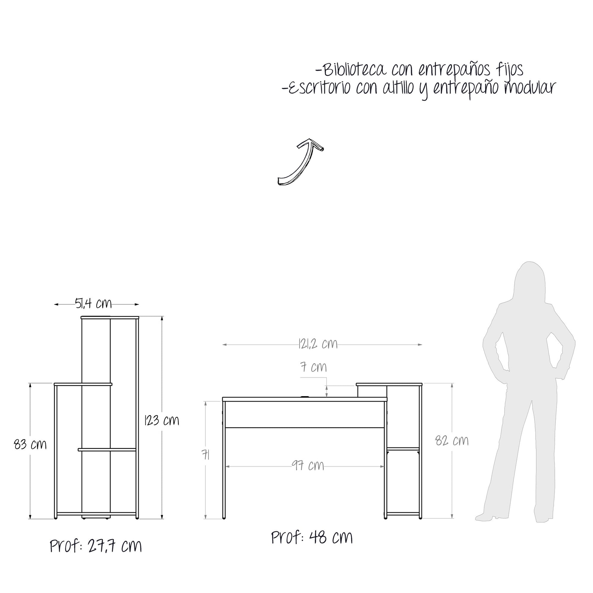 Combo ideal: escritorio con altillo y entrepaño modular + biblioteca con 3 entrepaños fijos. La combinación perfecta para optimizar espacio.