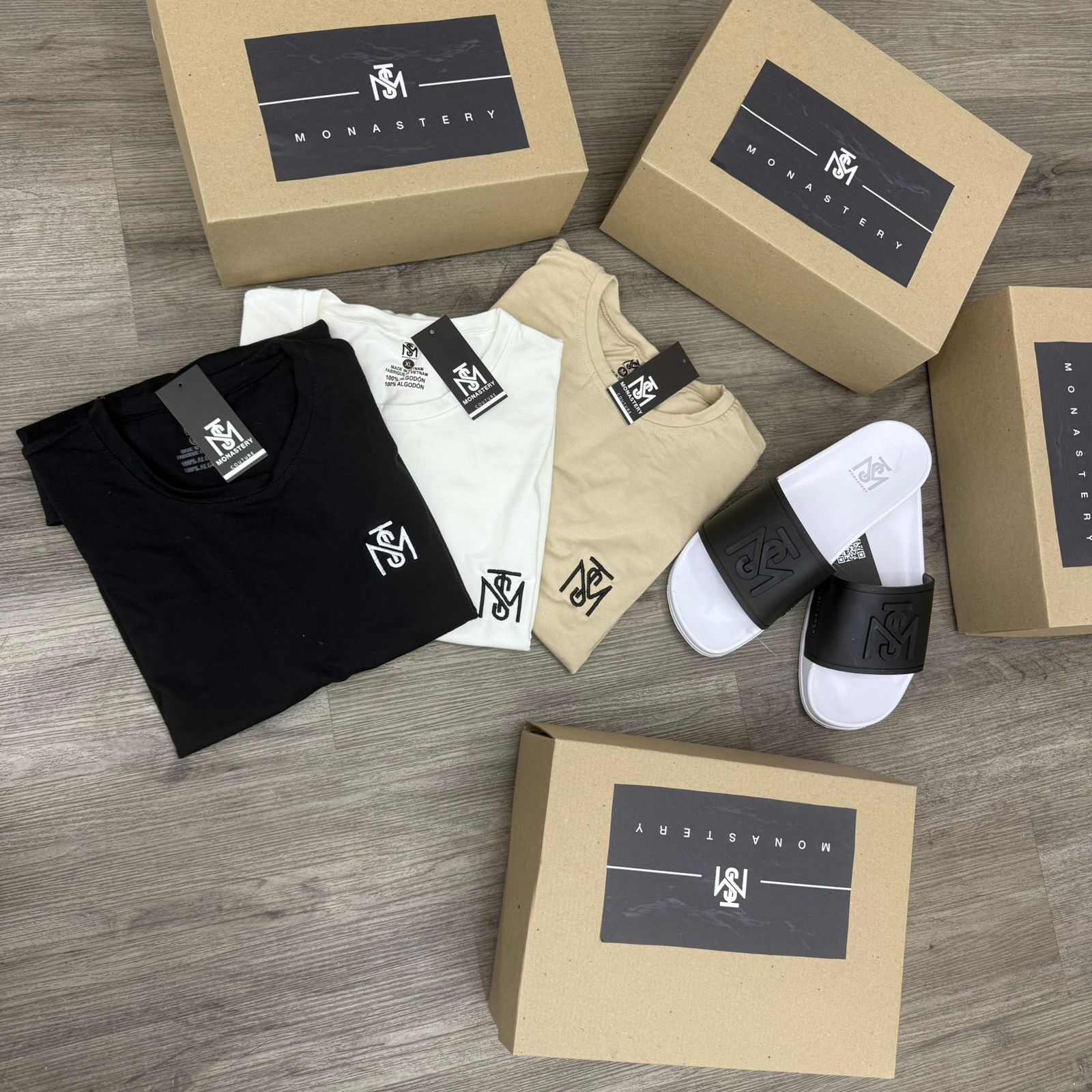 COMBO MONASTERY: CAMISETA + SANDALIA 👕 CAMISETA MONASTERY• Diseño fino y fresco, elaborada en algodón con licra para mayor comodidad y ajuste.• Gramaje 200, con terminados de alta calidad y marquilla tipo réplica premium.• Disponible en 3 colores clásicos: Negra, Beige y Blanca.• Tallas: S, M, L, XL, XXL⚠️ La talla XXL tiene un costo adicional debido a su confección especial. ⸻ 🩴 SANDALIAS MONASTERY• Diseño moderno con logo en alto relieve.• Garantía de 60 días por defectos de fabricación.• Se manejan en tallaje EUROPEO, con la siguiente equivalencia:SE MANEJA EN TALLA EURO, el cual la talla 40 seria 38 talla colombiana41 Euro=39 talla colombiana42 Euro=40 talla colombiana43 Euro=41 talla colombiana44 Euro=42 talla col… 📦 EMPAQUE Y ENVÍO• El combo se entrega en una elegante caja marcada MONASTERY, dentro de bolsa de seguridad gris.• Despachos el mismo día:• Pedidos entre semana antes de las 2:00 p.m.• Sábados hasta las 10:00 a.m. ⸻ 🔹 Producto de excelente calidad, fabricado directamente por nosotros.🔹